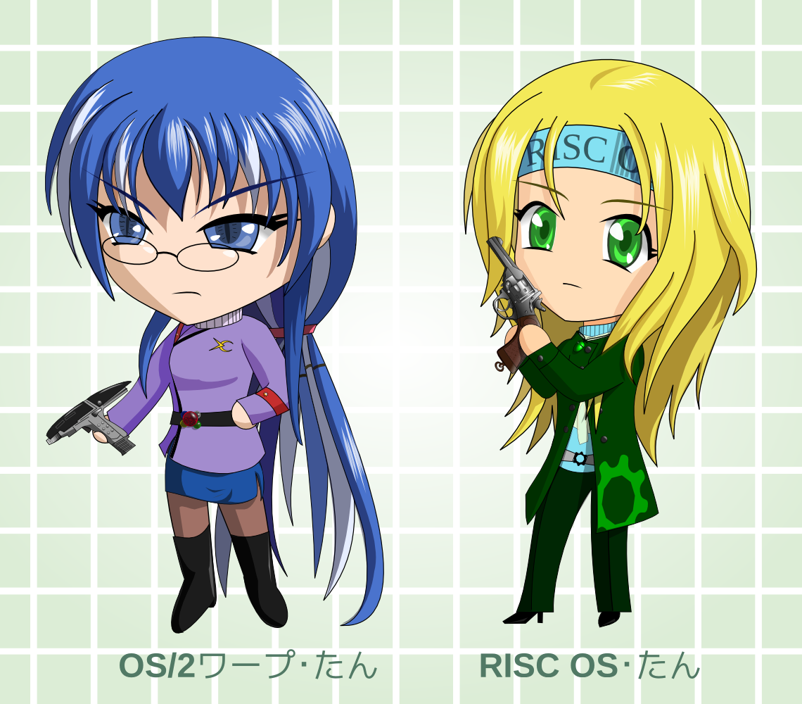 This is a remaster of C-chan's third chibi set, taking full advantage of the SVG source file containing the complete artwork. Apart from fixing some earlier glaring defects (such as OS/2-tan's head position), updating her uniform to what would later become her established look (although her hair remains tied in this picture), and modernizing key features such as their eyes and mouths. A quick background was also added to break the monotony of his chibi sets and the Japanese labels imported into Inkscape.