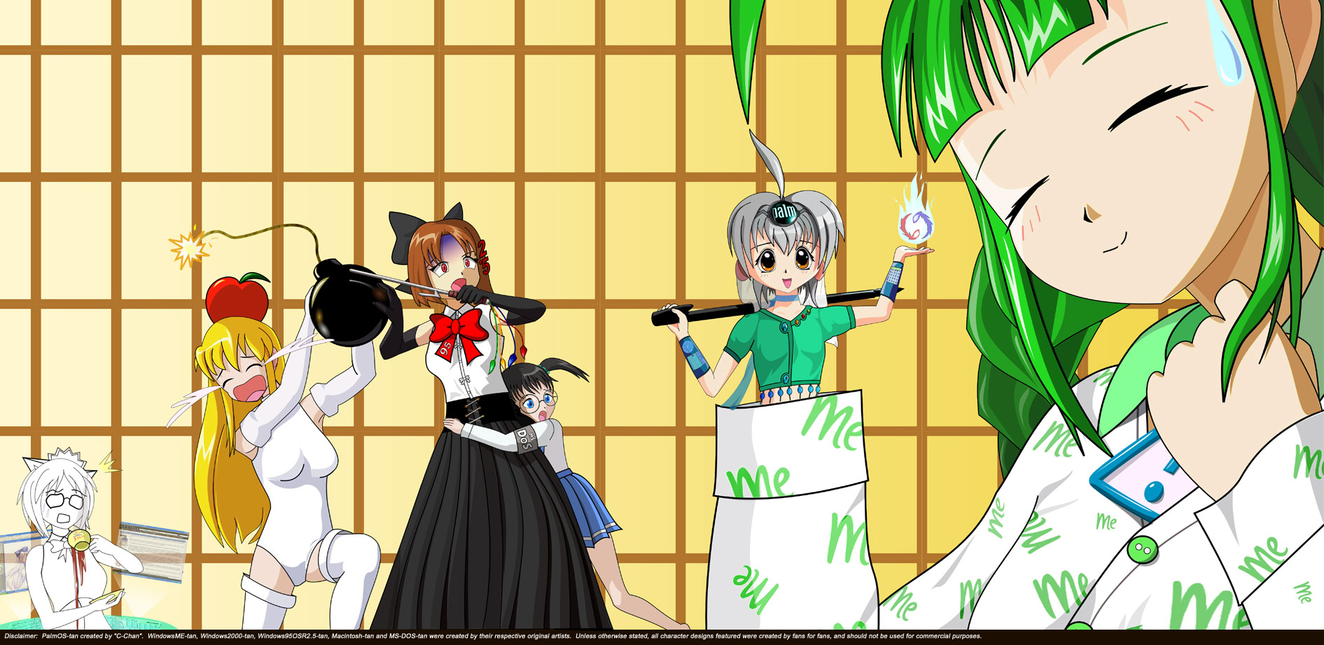 A pajama-clad Windows ME-tan is the unfortunate host this time around, but doesn't seem to mind at all. Windows 2K-tan, Mac-tan, Windows 95 OSR 2.5-tan and MSDOS-tan, on the other hand, are exhibiting what can best be described as a NORMAL reaction to seeing someone's hand turn into a little person. ^^'