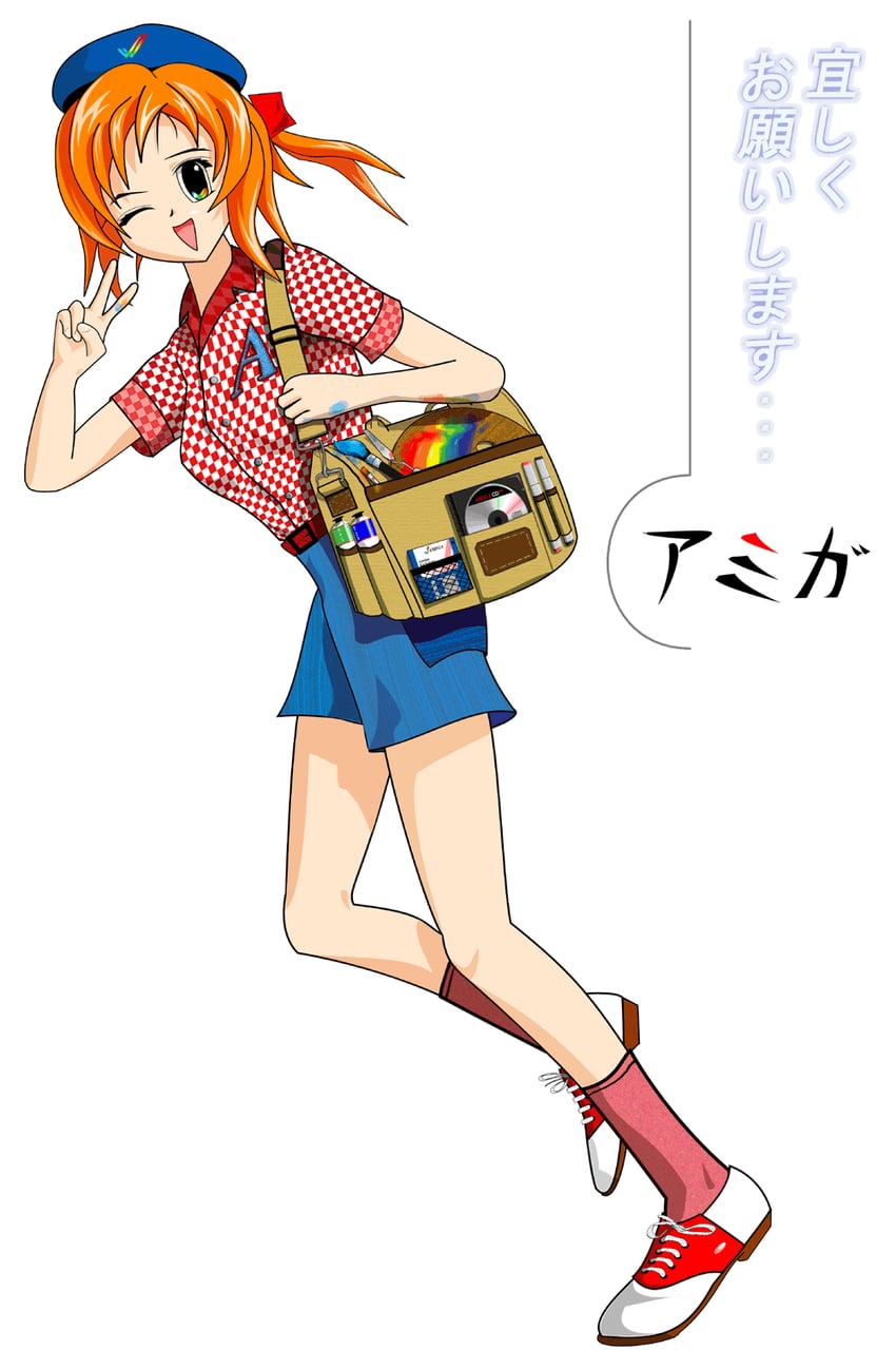 AmigaOS-tan was depicted as a tall, friendly and multi-talented young women and step-sister of the old Commodore sisters. She's an artist and a musician, but also enjoys games as well. Her 50's inspired boingball-themed rolled dress shirt, shorts and saddle shoes are meant to exude vintage comfort, but she's appeared in later drawings dressed differently. The japanese text on the corner can be conveniently summarized as "Pleased to meet everyone".