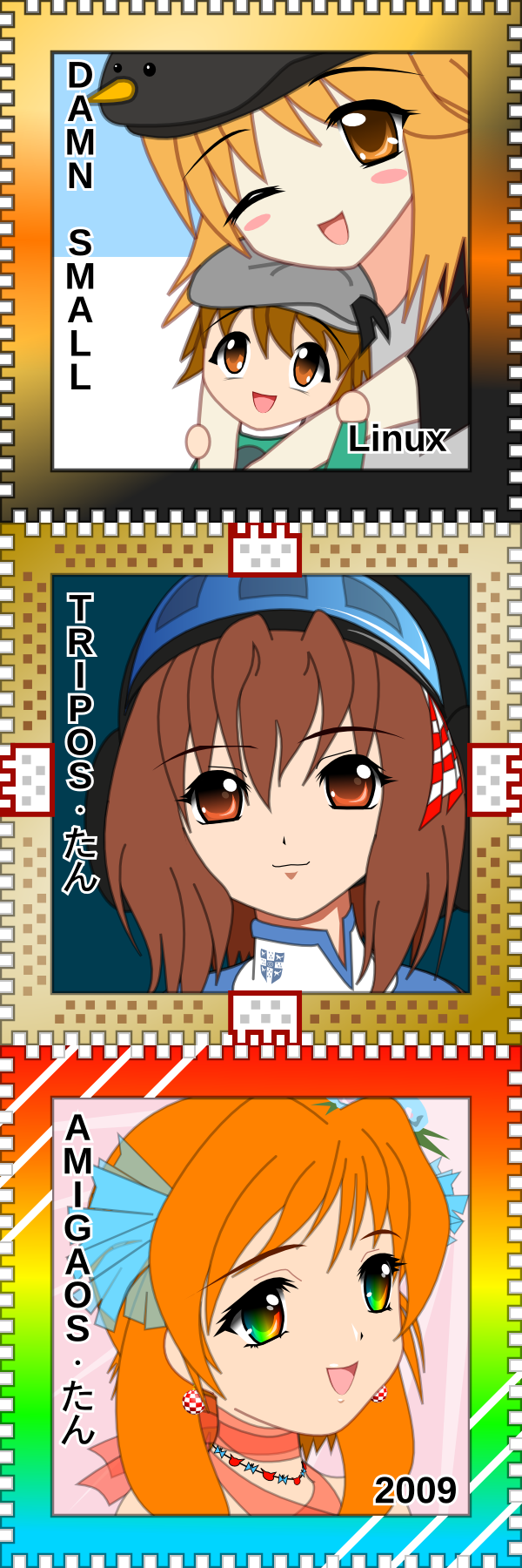amiga-tan, tripos-tan, damn small linux-tan, and damn small linux-kun (linux and 2 more) drawn by c-chan