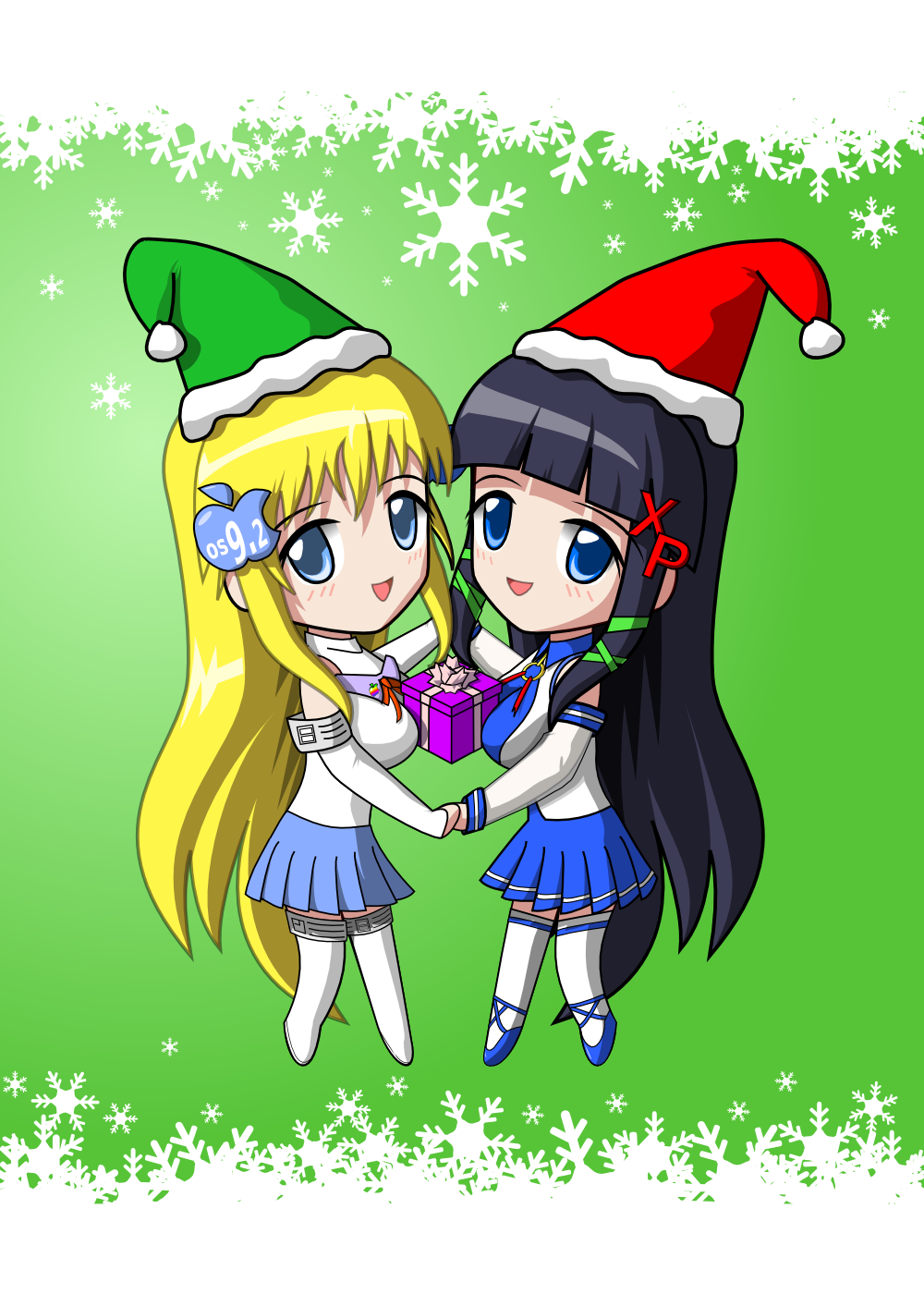 Windows XP-tan is thought to be paired with an obscure a character as Mac OS9.2-tan to drive the point that whoever drew Mac OS9.2-tan obviously borrowed heavily from XP-tan's design. Even the way the Christmas present is held highlights how eerily identical their... endowment... is.