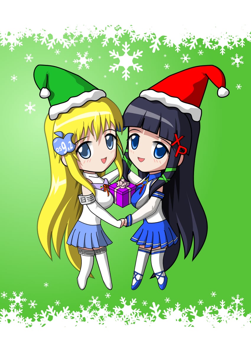 A remaster of an old C-chan holiday card featuring chibi Mac OS0.2-tan and Windows XP-tan in full Christmas mood. Only a slight cleanup of their eyes and hair was done to the chibis themselves -- however, to celebrate its posting on DA, the background has been reworked entirely to be more generic and usable by anyone.