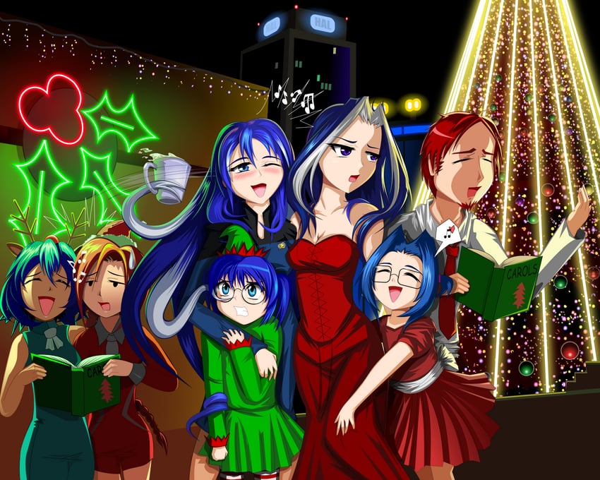 OS/2-tan is a rival with OpenVMS-tan; yet a few mugs of eggnog seems to have loosened her up a bit. Here she is, leading this merry lot in a round of Christmas carols, much to the (substantially more sober) OpenVMS-tan's chagrin.