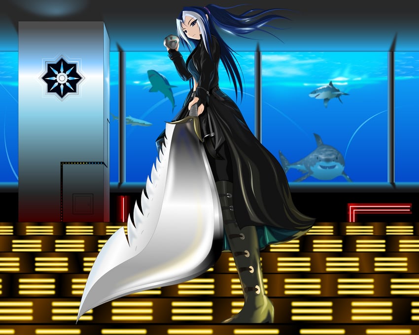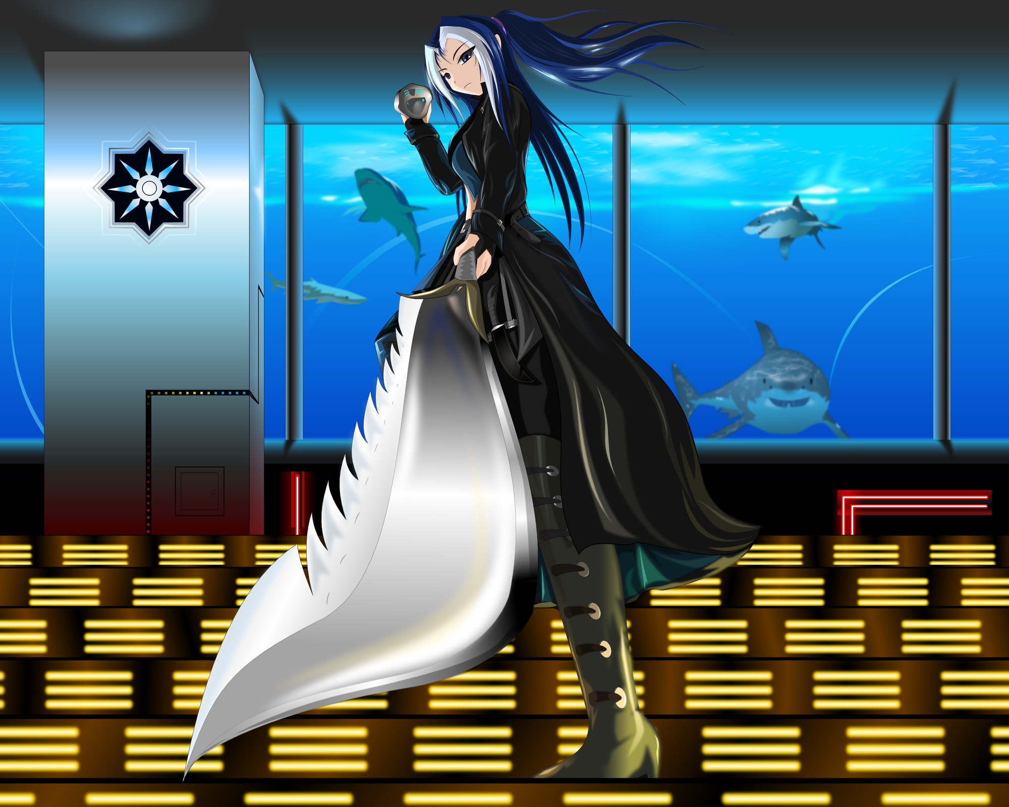 The drawing is a full-body portraiture of OpenVMS-tan, a powerful swordswoman and geomancer who used to be one of the most capable DEC officers, but now heads an influential OS-tan faction called the "CIOST" (or "Confederation of Independent OS-tans"). Aside from the leader, she is also the captain of an enormous submersible that serves as the CIOST headquarters, and in which the current setting takes place. She is also a passionate admirer of sharks and keeps a few in a non-isolated tank as free-range pets. The large cleaver she wields is decorated/sharped along the bladed edge by steel-coated shark teeth.
