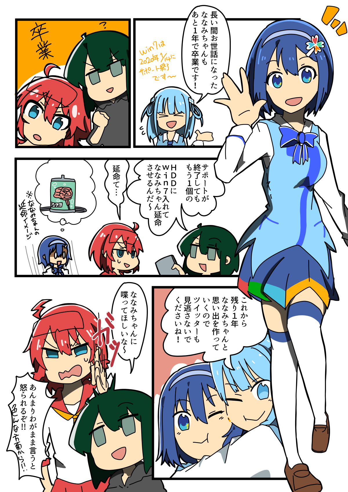 2009年の10月22日から愛されてきたOS「windows7」が来年1月14日にサポート終了!その前にななみちゃんと思い出を作ろうと、windows10のサポーター、窓辺とおこちゃんはいろいろ企画を考えているようで...?アキバのPCショップ店員によるドタバタ漫画、139話め!